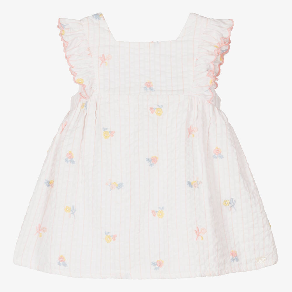 A sweet white dress for little girls by Tartine et Chocolat, made in lightweight cotton muslin. Woven with vertical stripes, this fully lined dress is delicately embroidered with summery yellow, blue and pink flowers for added charm. There are pretty frills on the shoulders and a concealed zip on the back to ensure a comfortable fit. The brand's logo charm can be seen on the hem.