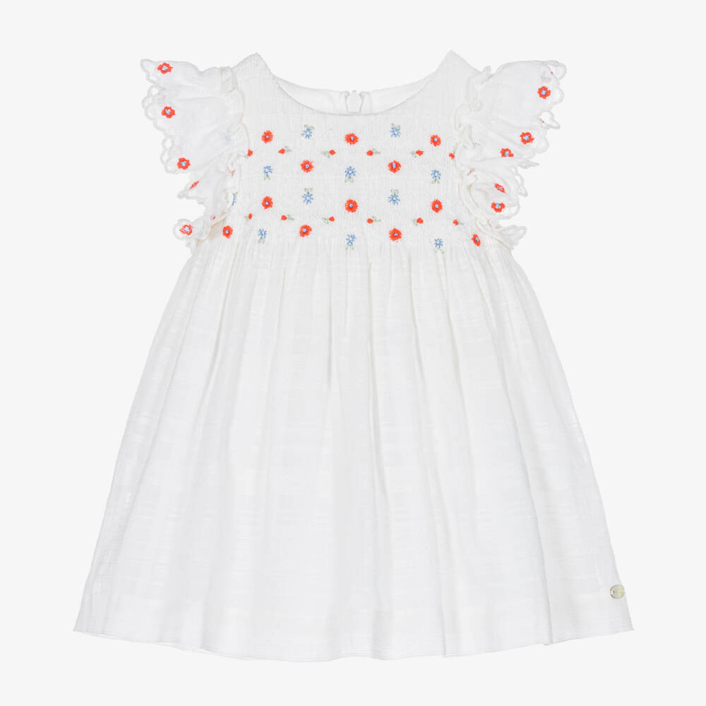 White dress for little girls by classically-styled French brand Tartine et Chocolat. Made in lightweight voile with irregular, stitched stripes, it is smocked across the bodice and beautifully hand-embroidered with red and blue flowers. There are matching, embroidered ruffles over the shoulders and a mother-of-pearl logo charm sewn above the hemline. Fully lined in voile for comfort, it fastens with a neat, concealed zip around the back.