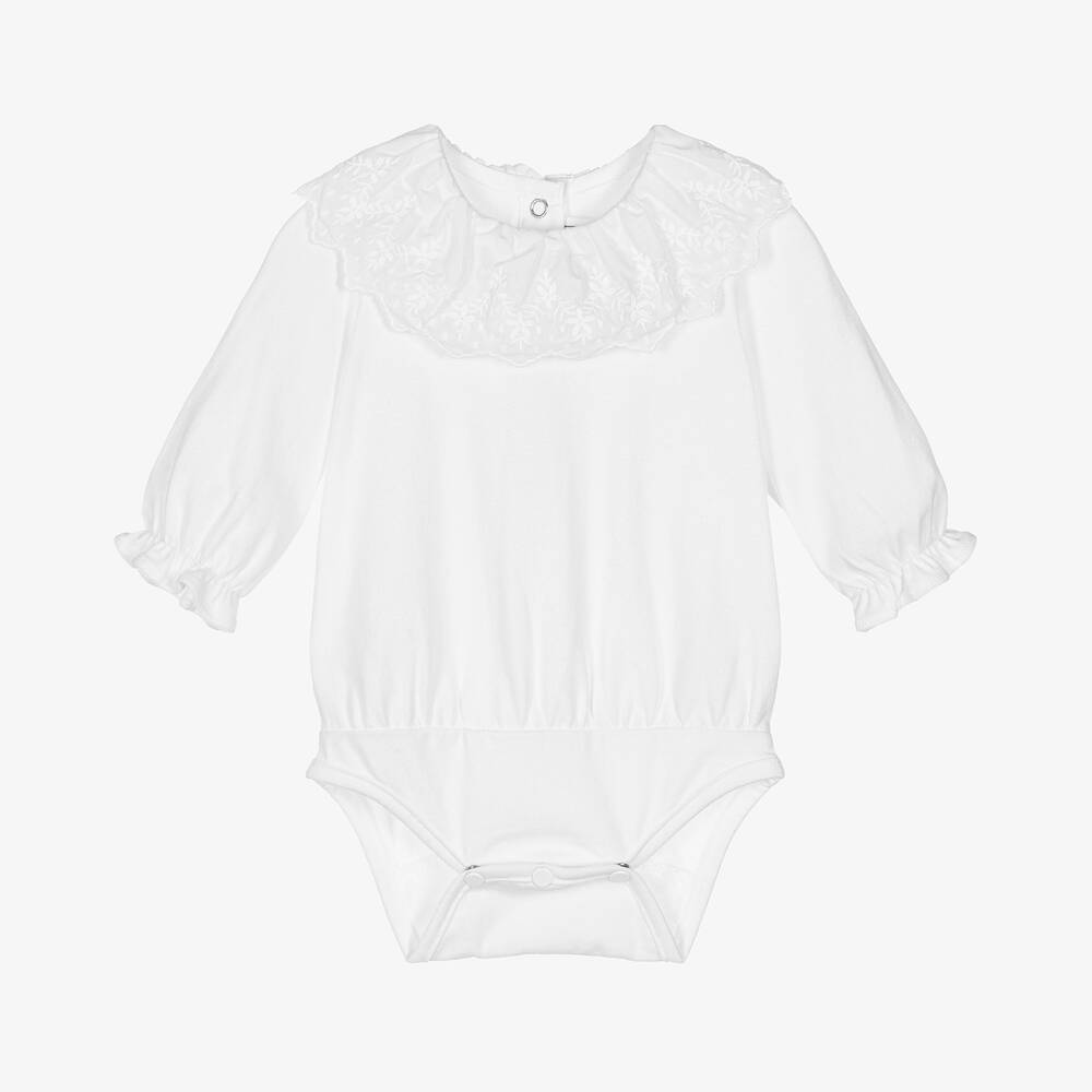 Pretty white cotton bodysuit for baby girls by traditional French brand Tartine et Chocolat. Made in soft, comfortable jersey, it has a lovely ruffled voile collar, embroidered with flowers. It fastens with easy-to-use poppers on the back and between the legs.