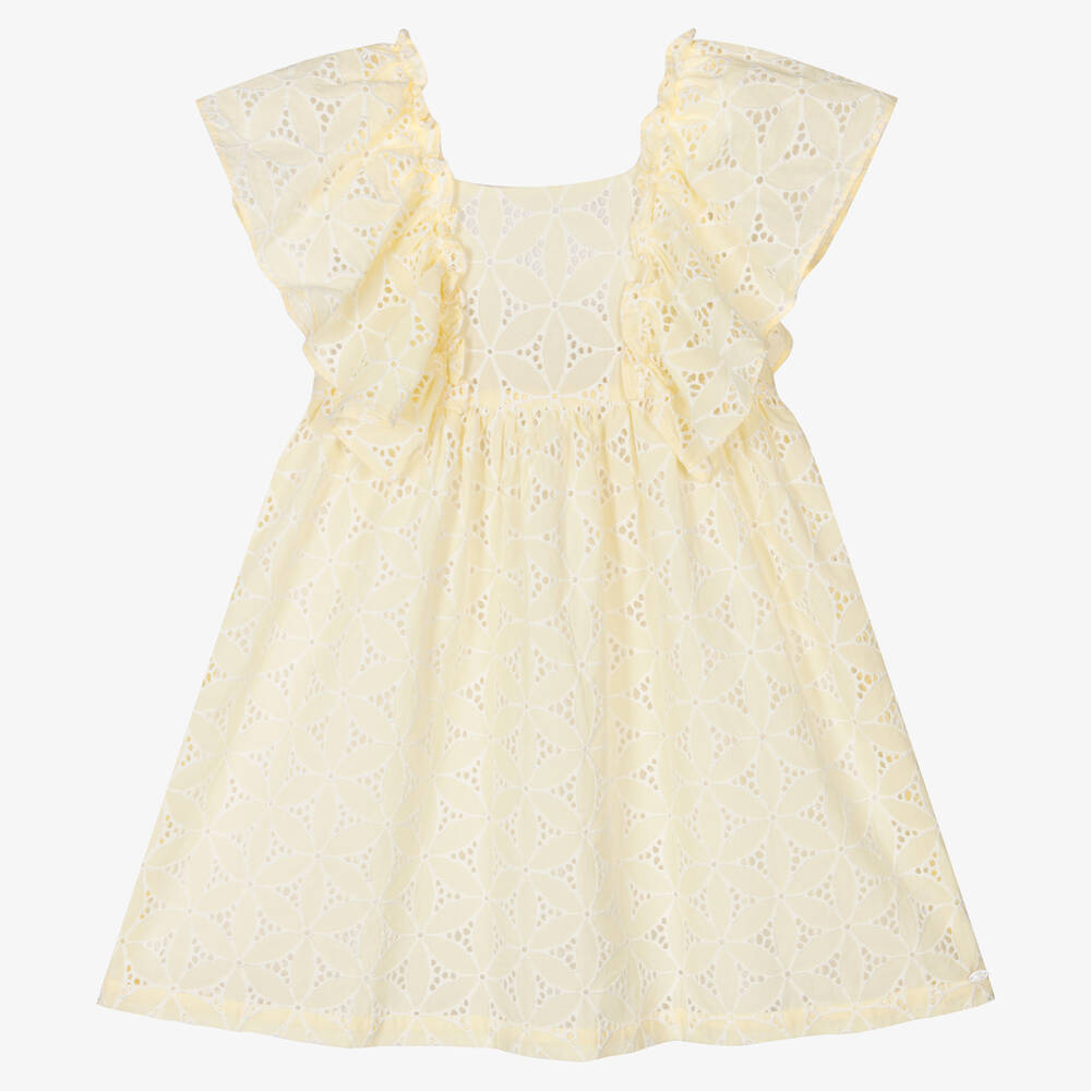 Beautiful yellow dress for girls from luxury brand Tartine et Chocolat. Made from broderie anglaise embroidered cotton voile, it is lightweight and the A-line cut allows movement in the skirt. Fully lined, it has pretty flutter sleeves and a concealed zip fastening on the back to make dressing easier whilst keeping a seamless finish.