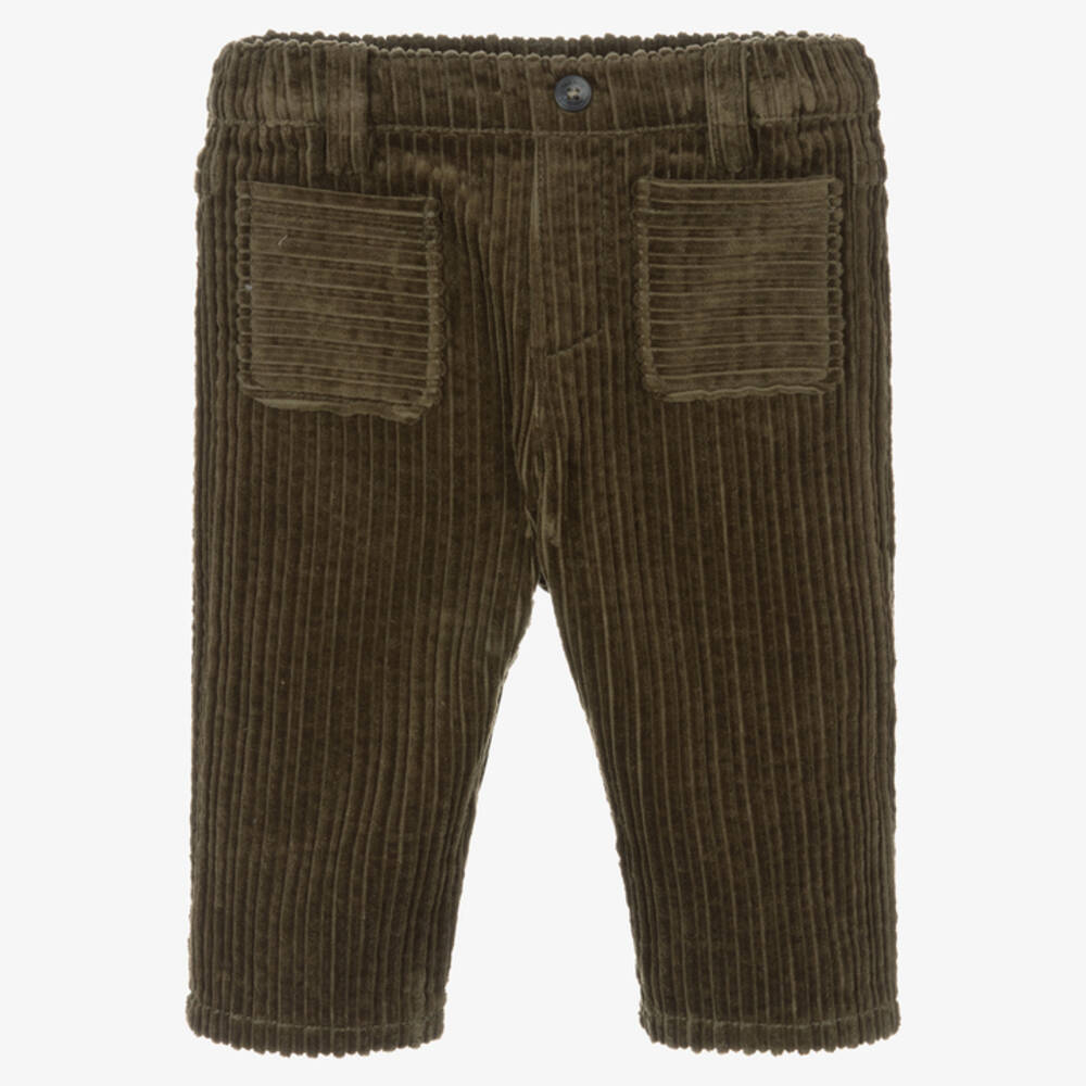 Green cotton trousers for little boys by Tartine et Chocolat, made in soft durable corduroy. Great for pairing with shirts and tops, these comfortable bottoms have patch pockets on the front and back, one of which is embroidered with the designer's initials. Featuring a decorative button in the centre, the adjustable waistband can be easily altered as little ones grow.