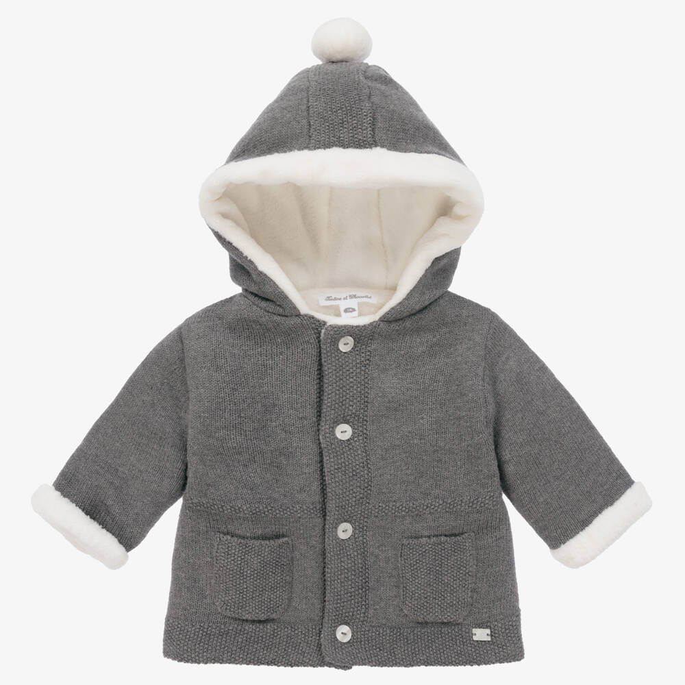 Cosy grey hooded pram coat for baby boys and girls by classic French brand Tartine et Chocolat. Knitted in a soft cotton, wool and cashmere blend, it has sweet moss stitch detailing and front patch pockets. There are logo button fastenings and a logo charm sewn by the hemline. The hood has a super soft, white faux fur pom-pom on top, coordinating with the warm, faux fur lining.