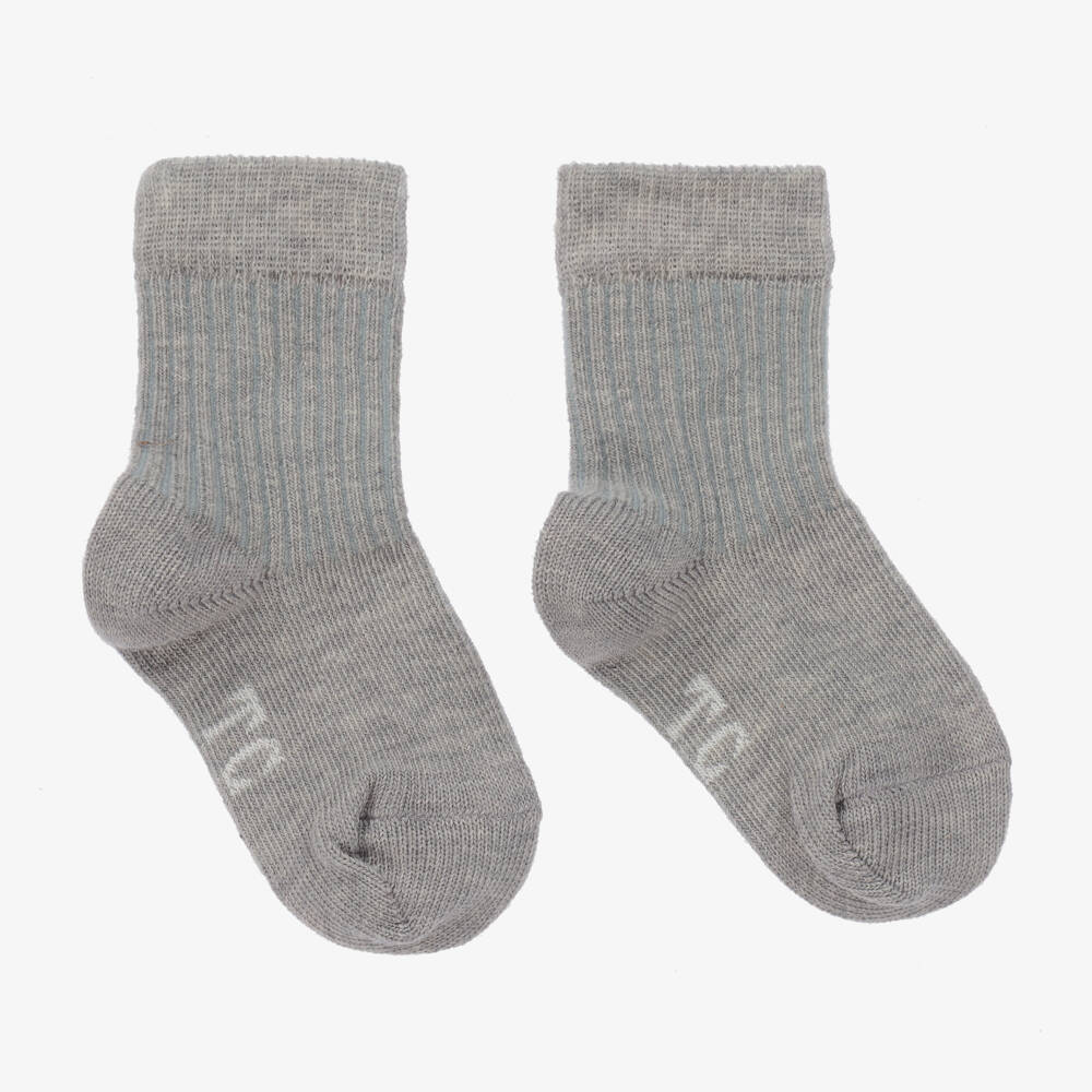 Cute blue grey ankle socks for little boys and girls, by Tartine et Chocolat. Knitted in a soft cotton blend, they have a small white logo underneath the foot.