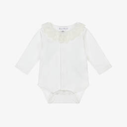 Sweet ivory bodysuit for baby boys and girls by French brand, Tartine et Chocolat. Made in soft cotton jersey for comfort against little one's delicate skin, this plain babysuit has a rounded collar with the designer's initials embroidered in grey. There is a concealed placket on the front with popper fastenings and poppers between the legs to help with easy dressing and changing.