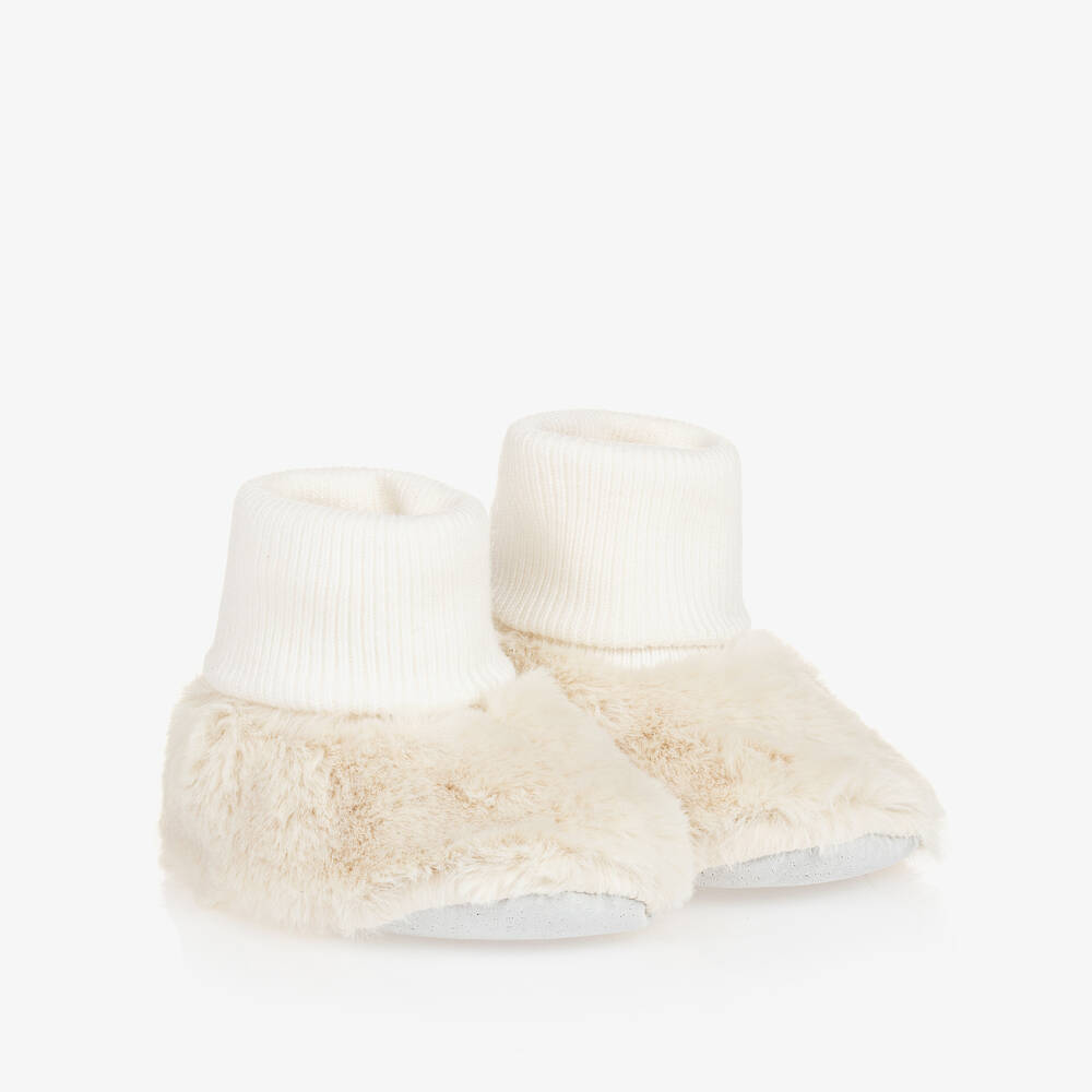 Adorable ivory booties for baby boys and girls by Tartine et Chocolat. Made from super soft and cosy faux fur, they have tonal fold over ankle cuffs made from stretchy ribbed jersey making them easy to slip on. The smooth textile insole is lightly padded, and the pale blue leather outsole is flexible for comfortable wear.