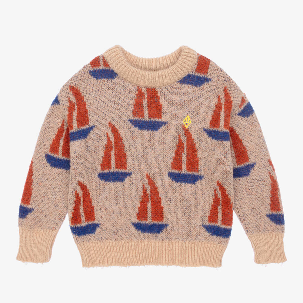 Beige crew neck sweater for boys and girls by The Animals Observatory. Knitted in alpaca wool blend, this cosy layering piece has a jacquard boats design for a graphic finish. Bold and striking, this fun sweater has a bright yellow logo embroidery on the chest for a contrasting finish.