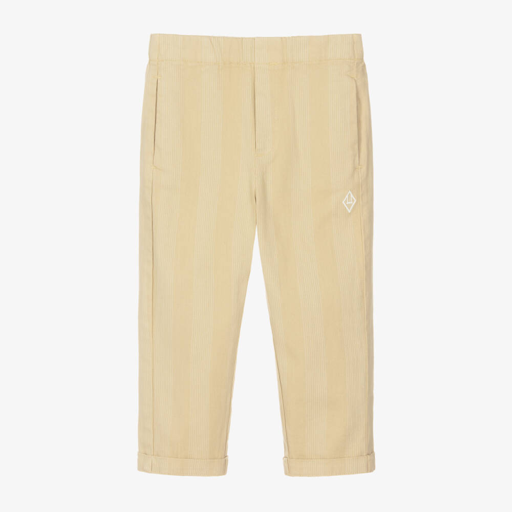 Beige striped trousers for boys and girls by The Animals Observatory, made in durable yet soft cotton twill. This casual, easy-to-wear style has a relaxed, tapered fit with an elasticated waistband and concealed side seam pockets. Completing the look with a signature designer touch, there is an embroidered white logo on the front.