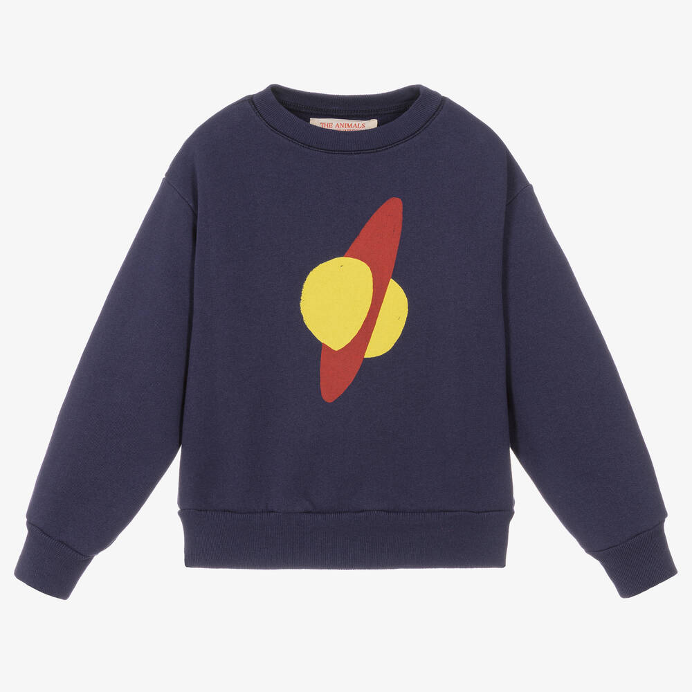 A deep blue sweatshirt for boys and girls from The Animals Observatory, made in soft, mid-weight cotton jersey. A cool layering piece, it has dropped shoulders, softly ribbed trims and a distressed-effect print of a yellow and red planet across the front.