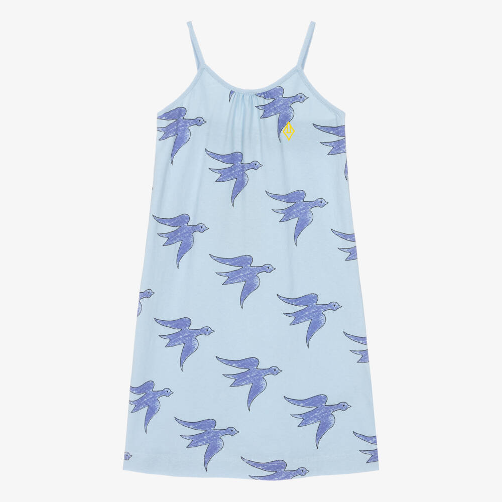 Lovely pale blue cotton dress for girls by The Animals Observatory, with a flying blue bird print in a sweet, hand-drawn, distressed style. Loose-fitting with little gathers around the neckline and spaghetti straps, it is made in comfortable jersey and is just right for sunny days. The brand's logo is embroidered in yellow on the chest.