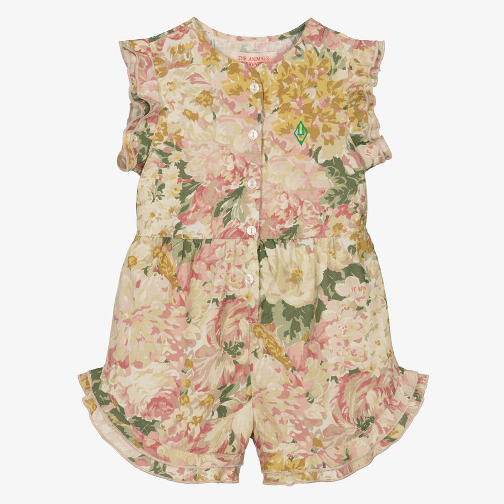 A pretty pink and green playsuit for girls by The Animals Observatory, made in a soft and lightweight cotton weave. Fastening with pearlescent buttons, this casual one-piece is printed with beautiful florals in muted shades of pink, green and beige. It has layered ruffle trims on the sleeves and matching trims on the hems for a feminine look. Green logo embroidery can be seen on the chest which adds a discreet designer touch.