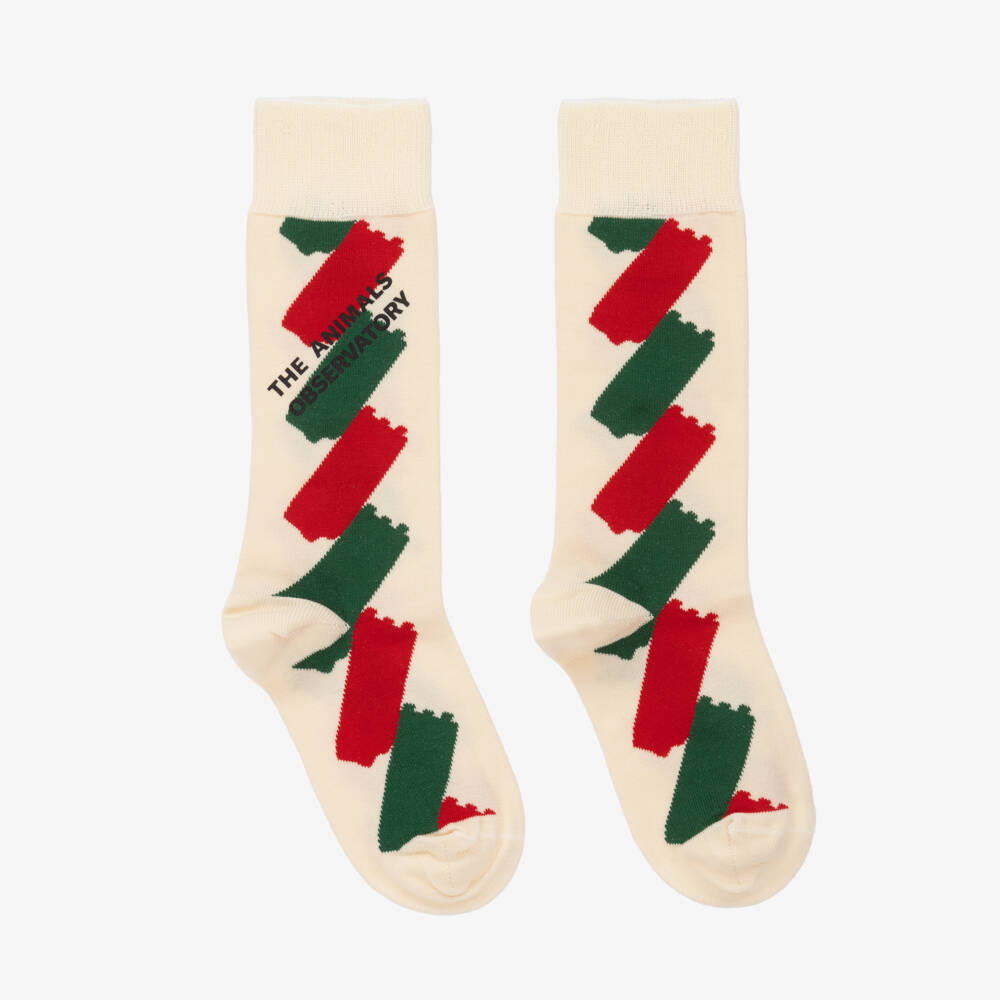 Ivory finely knitted cotton jersey socks for boys and girls by The Animals Observatory. These comfortable socks have interwoven red and green brush strokes and a black logo print on the sides.