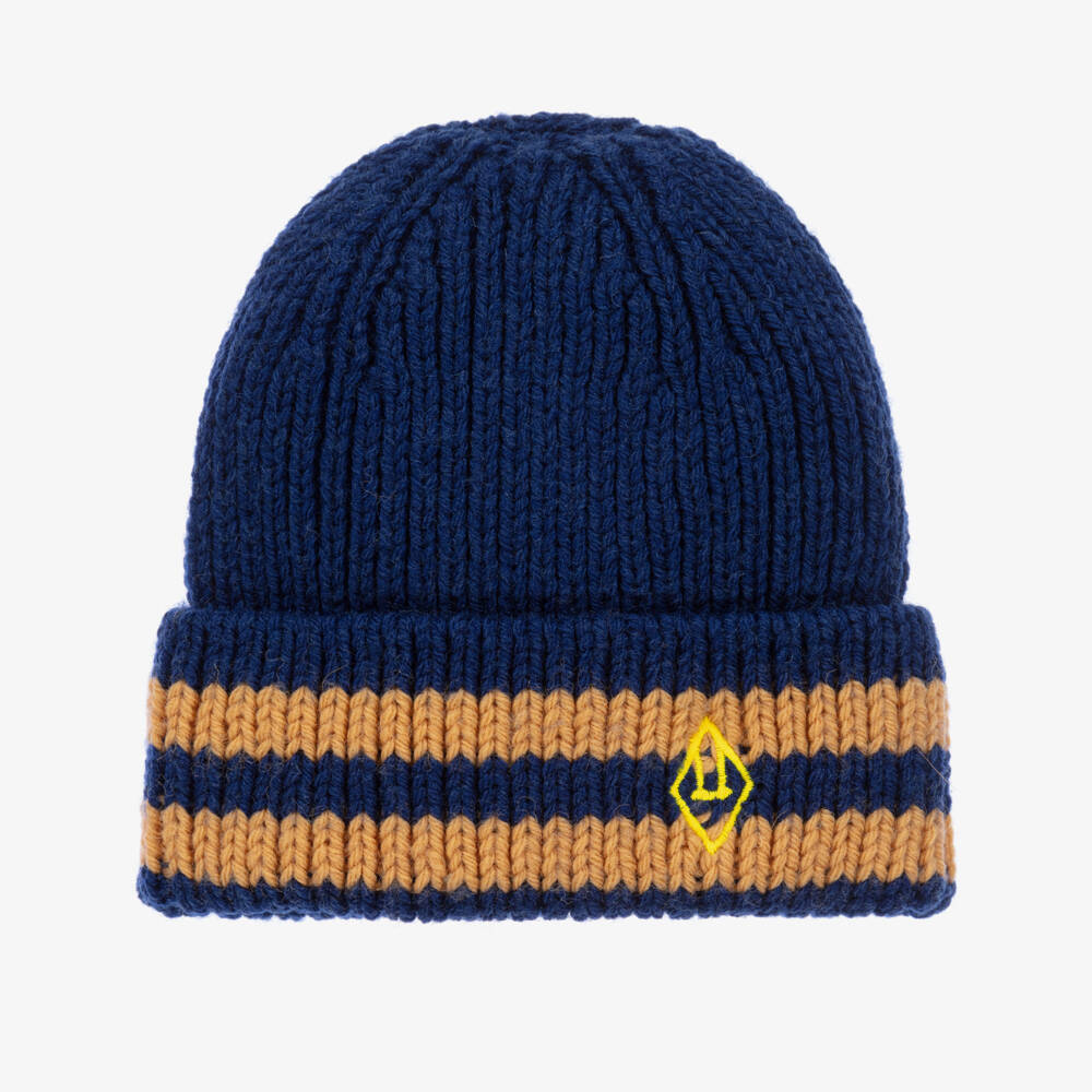 Navy blue ribbed beanie hat for boys and girls by The Animals Observatory, knitted in soft and cosy wool. It has contrasting beige stripes on the turn-up brim and an embroidered yellow logo on the front for a designer touch.