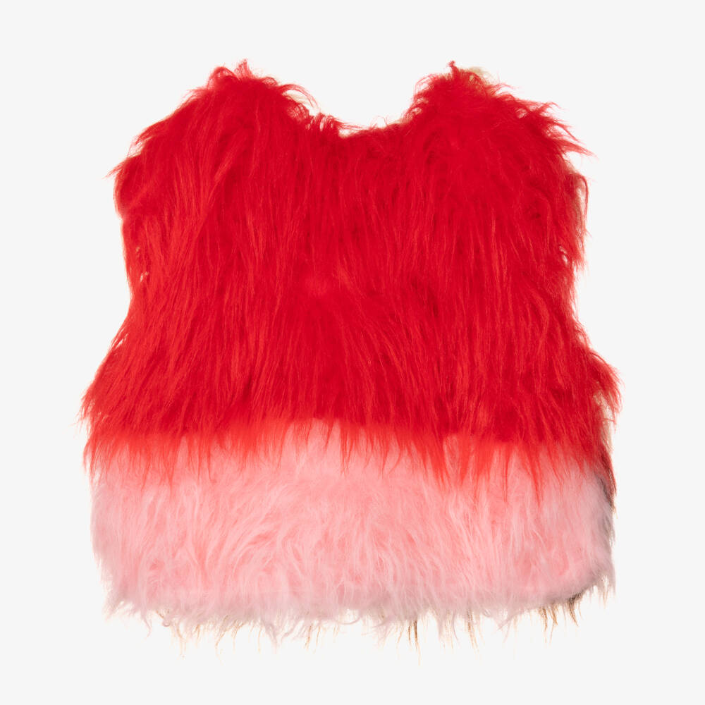 This colourblock slipover for boys and girls by The Animals Observatory is a true statement piece. Reflecting the label's off-beat style, this layering item is panelled in red, pink, ivory and brown faux fur for a quirky look. It has a silky lining and a hidden popper fastening on one shoulder to help with over-the-head dressing.