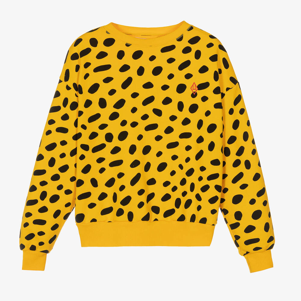 Bright yellow sweatshirt for teen girls by The Animals Observatory, with a red embroidered logo on the chest. Casual and comfortable, with an oversized fit, it has ribbed trims and is made in soft, mid-weight cotton jersey, with a fun black leopard print pattern.