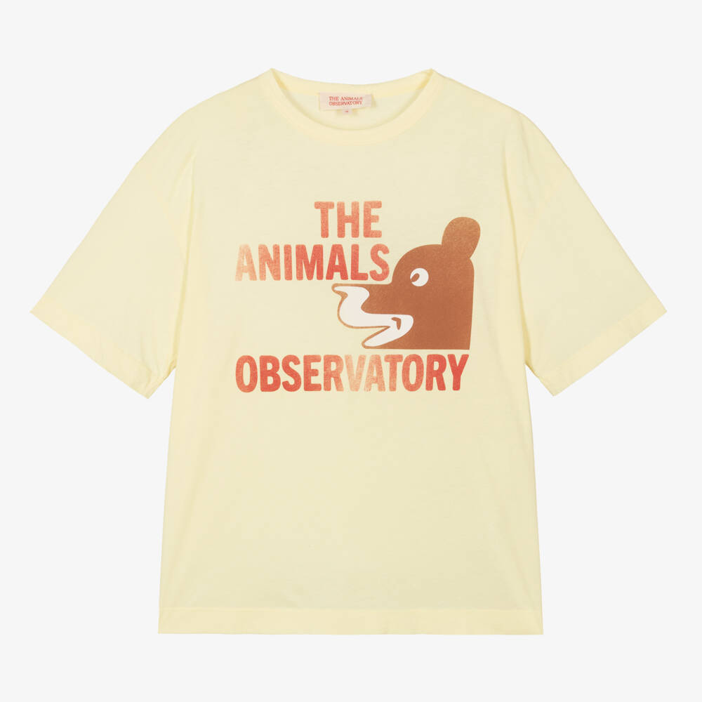 Oversized-fit, pastel yellow T-shirt from The Animals Observatory, for teen boys and girls. Styled with dropped shoulder short sleeves and a crew neck, the front has a fun brown bear and red logo print in a cool distressed finish. It is made in soft cotton jersey for casual comfort.