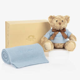 Adorable blue gift set for baby boys by The Baby Gifting Company, with a personalised blanket and teddy bear. Beautifully presented in a gift box, this sweet set makes an ideal keepsake for a special new arrival. It features an organic cotton chunky knit blanket, along with an adorable plush teddy bear wearing a cosy knitted jumper.