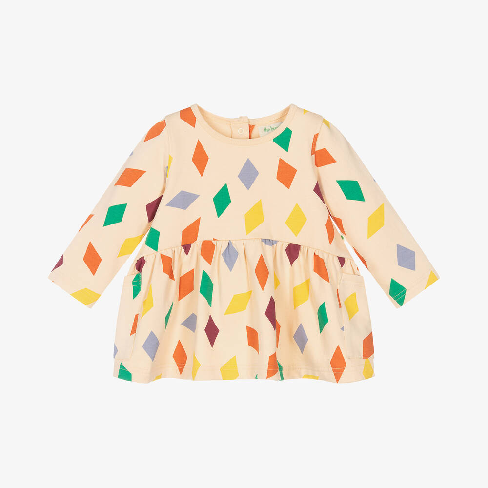 Dark ivory dress for baby girls by British brand the bonniemob, made in soft, mid-weight organic cotton jersey with a warm, fleecy inside. Gentle on delicate skin, this loose, wide-fitting dress has a brightly coloured diamond pattern with patch pockets on each side. There are useful popper fastenings on the back and the designer's signature apple logo tab on one side seam.