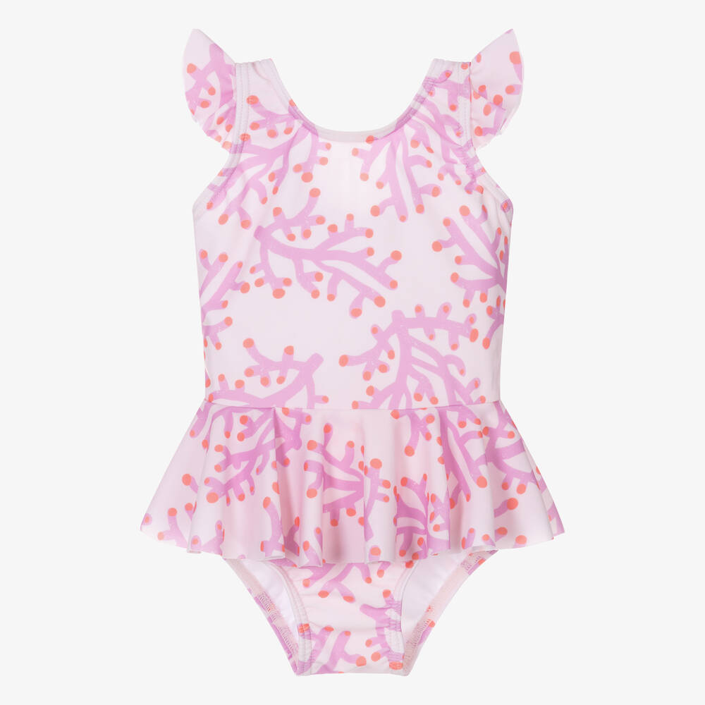 A pastel pink swimsuit for baby girls by Bonniemob, in a smooth sun-protective recycled fabric with UPF50+. It has a pretty coral pattern and ruffled trims for adorable beach or poolside styling.