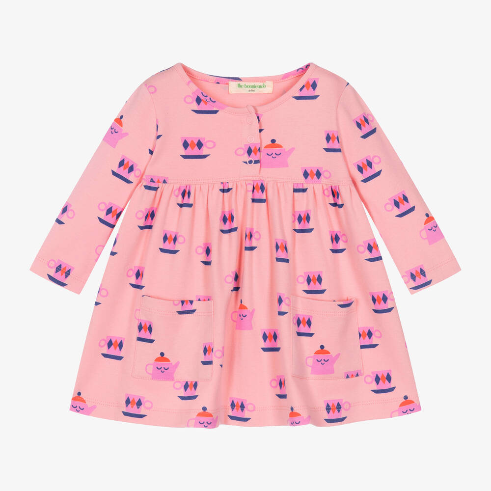 Adorable pink dress for baby girls by the bonniemob, made in super soft and comfortable organic cotton jersey. It has a sweet teacup and teapot print and fastens easily with poppers on the front. The gathered skirt has little patch pockets on the front and the British brand's signature apple logo tab can be seen on the side seam.