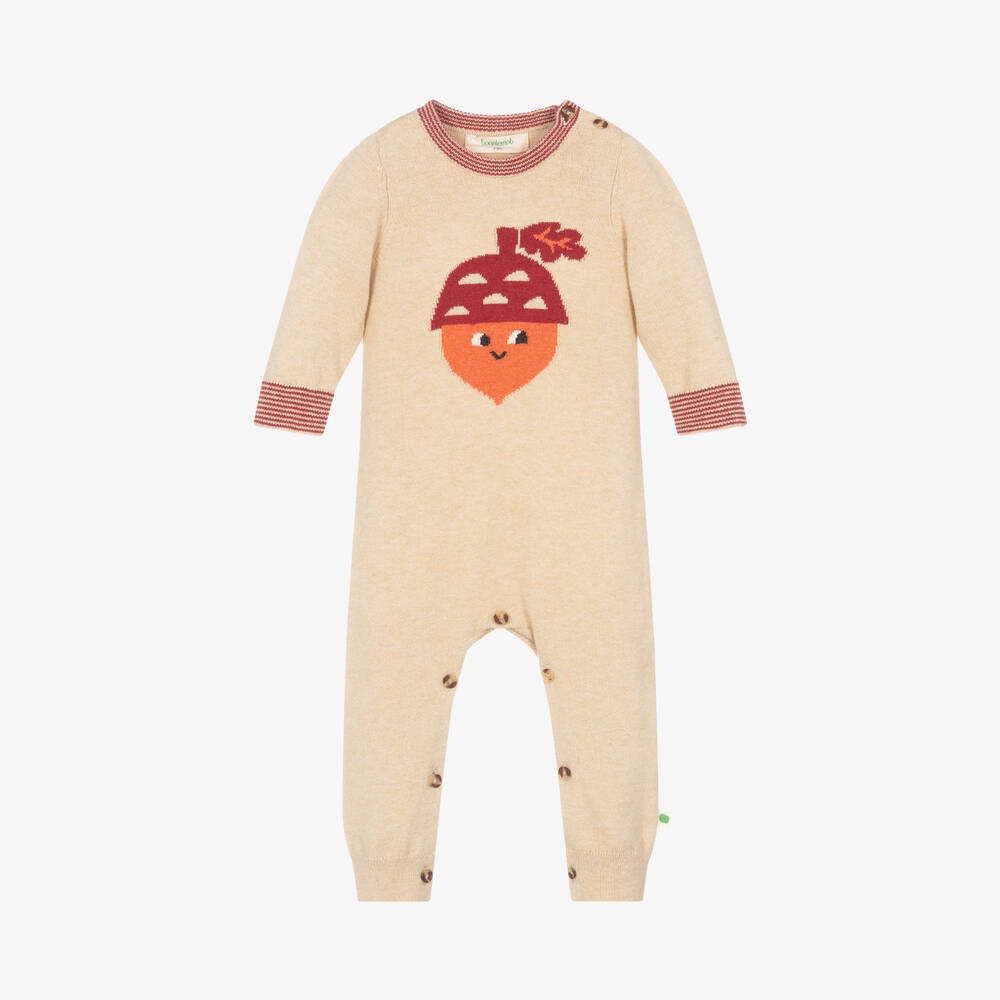 Beige knitted babygrow for boys and girls by British brand the bonniemob, made in soft organic cotton with a touch of cashmere for added warmth and luxury. This cosy romper has ribbed trims and a cute red and orange smiling acorn on the front. There are tortoiseshell button fastenings on one shoulder and between the legs and the designer's signature apple logo tab on one side seam.