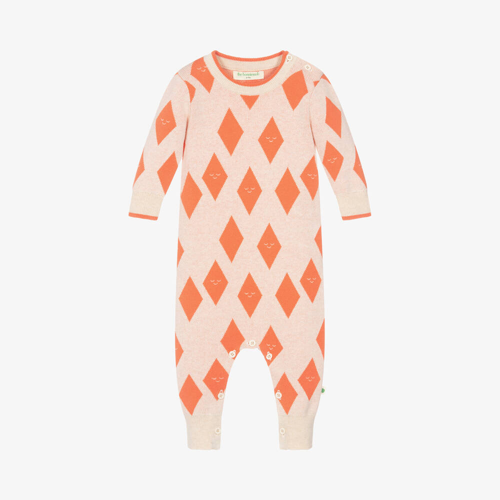 Beige romper for boys and girls by British brand the bonniemob, knitted in soft organic cotton. It has a fun orange diamond pattern with smiling faces and cosy ribbed trims. There are button fastenings on one shoulder and between the legs to help with dressing. The designer's signature apple logo tab is sewn on the side seam.