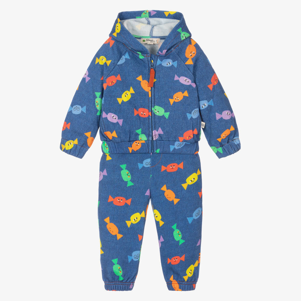 Blue with an all-over sweetie print, this cute and colourful tracksuit for baby boys and girls is by British brand The Bonnie Mob. Made in soft organic cotton, it has the look of denim with the comfort of jersey. The hooded top has a zip guard to protect little chins, and both pieces have useful little pockets and elasticated trims for a comfortable fit.