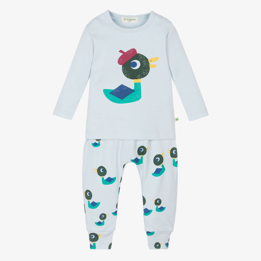 Cute pale blue top and trouser set for baby boys and girls from the bonniemob, made in soft organic cotton jersey. The long-sleeved top has an adorable duck print in green, red and yellow, with useful popper fastenings on one shoulder. Ideal for crawling and comfortable wear, the jogger-style trousers have a matching duck print, an elasticated waist and cuffed ankles. Both pieces are trimmed with a logo tab for a distinctive touch.