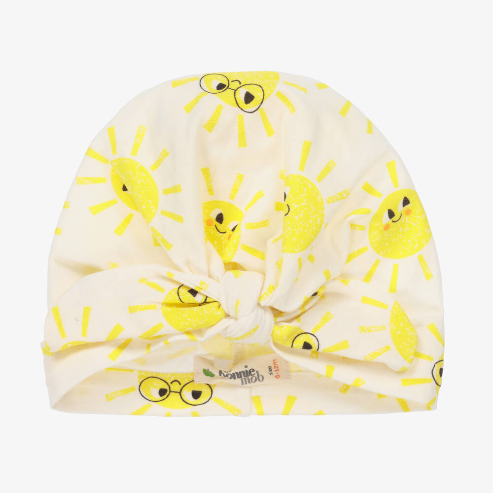 A sweet ivory turban hat for baby boys and girls by The Bonnie Mob, made in luxuriously soft organic cotton jersey. Designed in an all-over, bright yellow sunshine print, this breathable and stylish hat ties into a cute knot on the front.