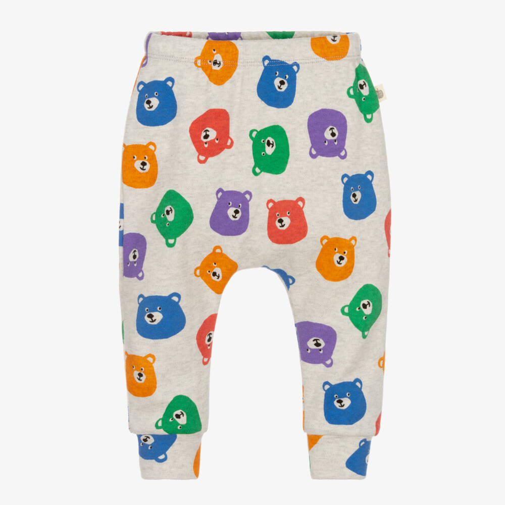 Cute and comfortable for baby boys and girls, these casual grey trousers from The Bonnie Mob are patterned with a colourful bear print. Made in super soft organic cotton jersey, they have a gently elasticated waist and cuffed ankles. The British brand's apple logo tab can be seen on the side seam for a subtle designer touch.