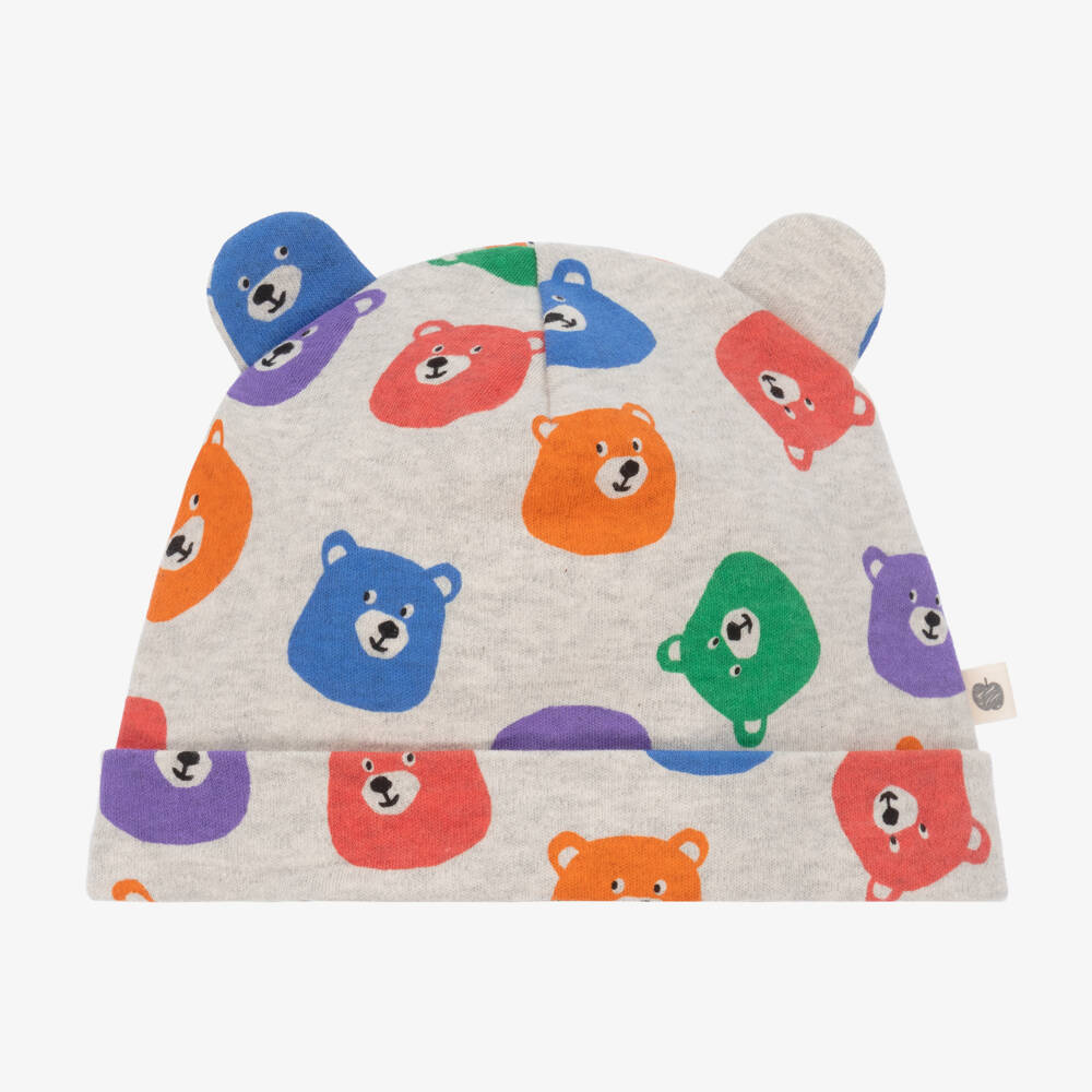 Cute grey hat for baby boys and girls from The Bonnie Mob, printed with a fun and colourful bear pattern. Made from comfortable organic cotton jersey that is soft and gentle for delicate skin, it has a turn-up brim and cute little ears on the top. A logo tab on the side seam adds a discreet designer finish.