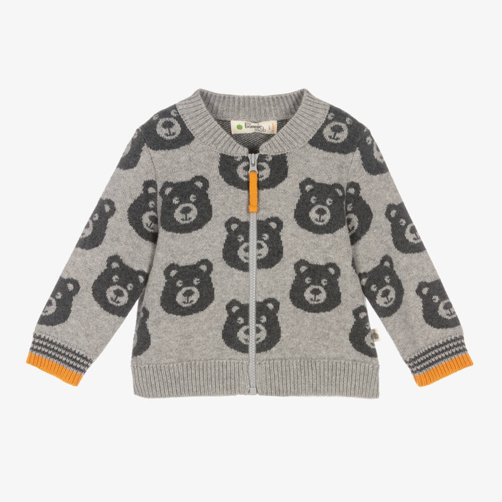 Grey with yellow trims, this adorable jacquard-knit bear cardigan for baby boys and girls is by British brand The Bonnie Mob. Cosy and comfy, it is made in a soft blend of organic cotton and cashmere, with a front zip fastening.