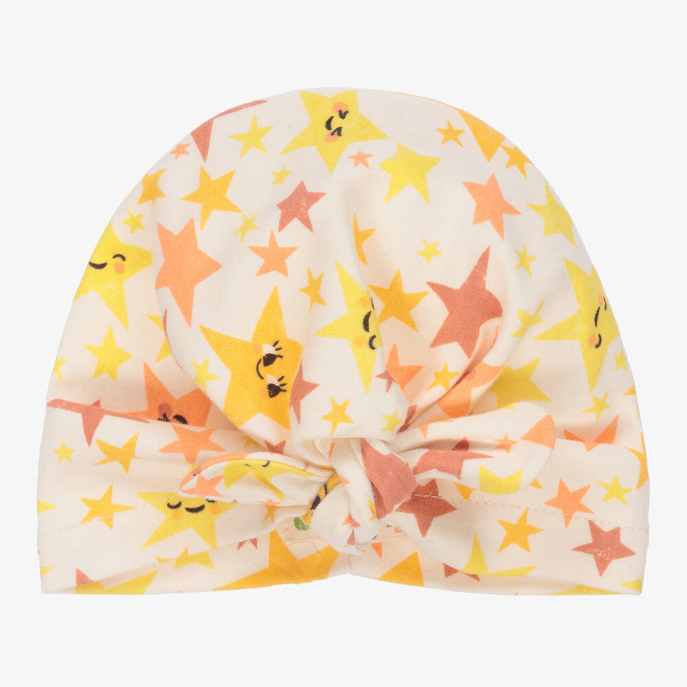 Ivory turban hat for baby boys and girls by The Bonnie Mob, printed with smiling stars in orange and yellow. It is made in soft organic cotton jersey and ties into a sweet knot at the front.