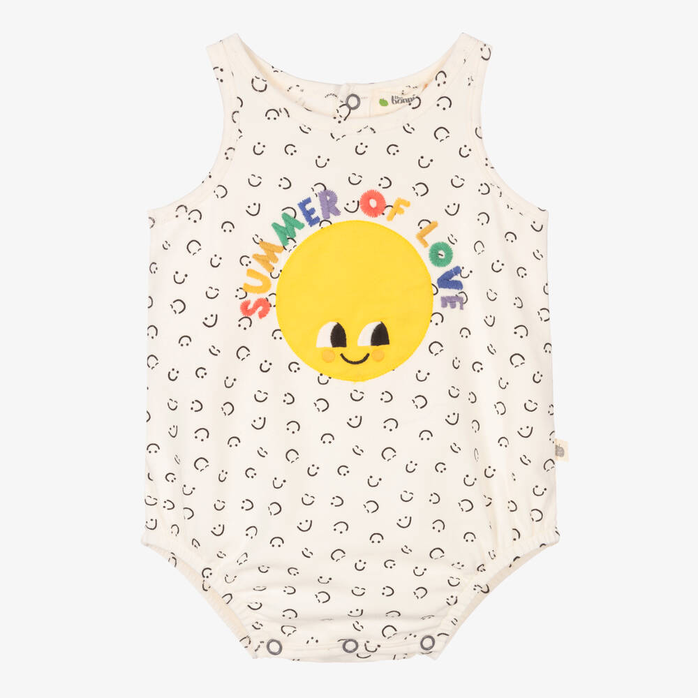 Ivory shortie for baby boys and girls by The Bonnie Mob, made in super soft organic cotton jersey. It has a cute bright yellow sunshine appliqué on the front bordered with multicoloured, embroidered lettering. Patterned in an all-over black happy face print, it has a comfortable round neckline with popper fastenings on the back and between the legs for quick and easy changing.