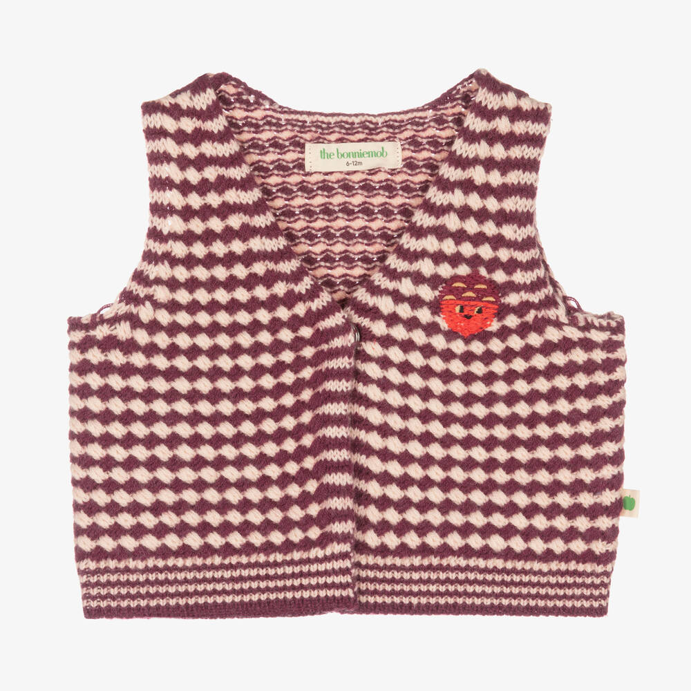 Red and beige checked waistcoat for baby boys and girls by British brand, the bonniemob. Knitted in a mid-weight blend of recycled wool and organic cotton, it has a cute red and orange smiling acorn embroidered on the chest. It fastens with popper on the front and the designer's signature apple logo is on one side seam.