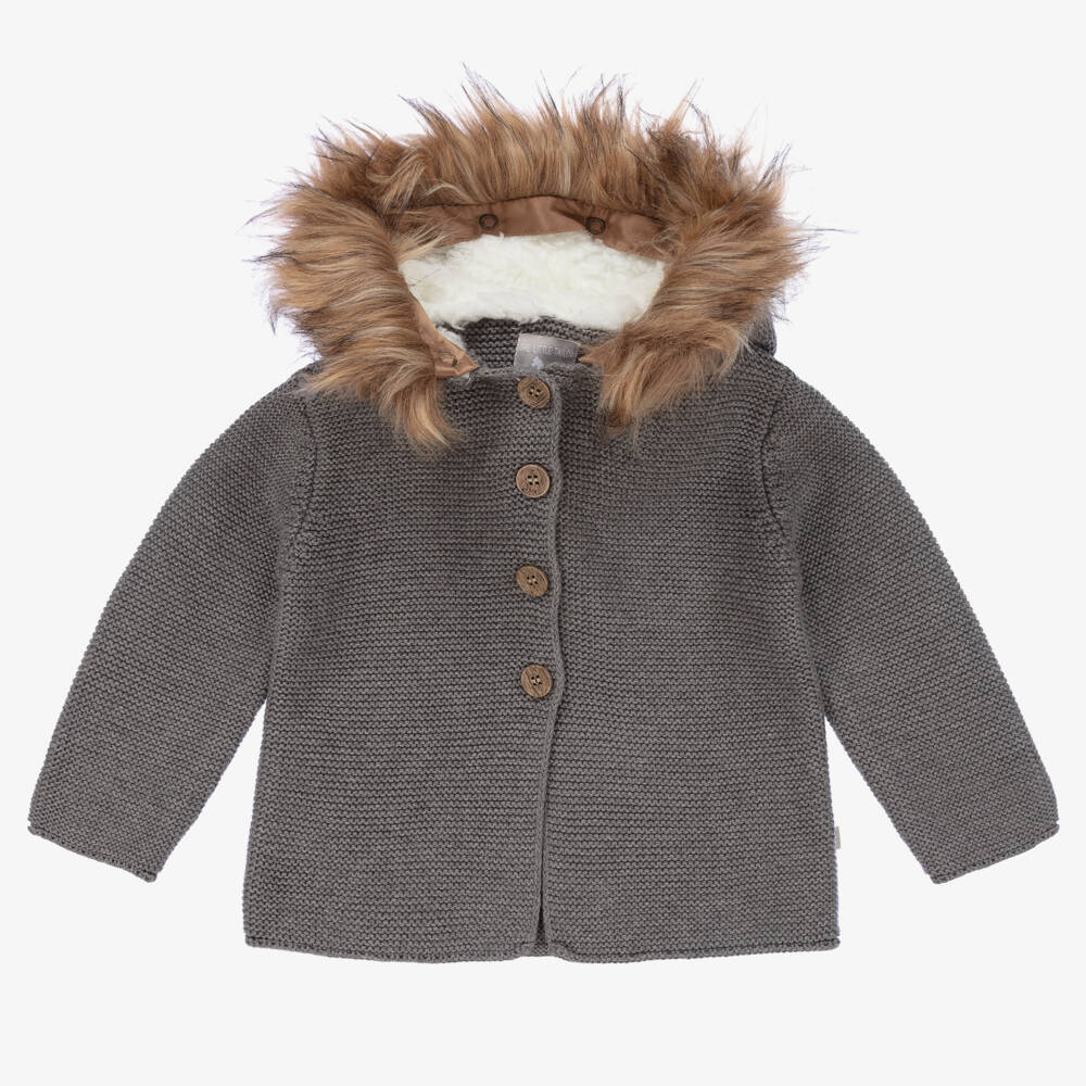 Dark grey hooded pram coat for baby boys and girls by The Little Tailor, knitted in soft cotton. The hood has a lovely plush lining for added warmth and a removable faux fur trim. It fastens with wooden buttons on the front. Ideal for wearing in the pram, this shorter length coat can also be worn as a cardigan on colder days.