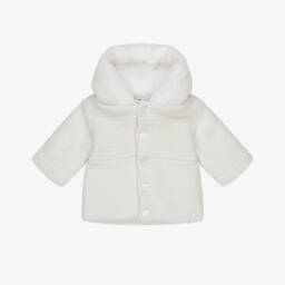 Ivory pram coat for baby boys and girls by The Little Tailor, knitted in soft cotton. Lined with beautifully soft faux fur for snuggly comfort, this warm coat has glossy button fastenings to keep out the cold chills.