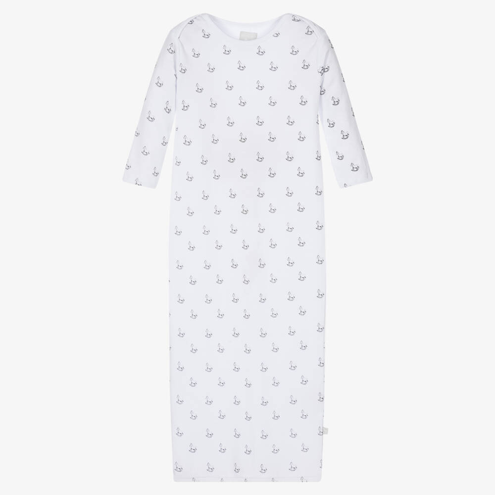 Long white night gown for baby girls and boys by The Little Tailor. Made in soft cotton jersey, it has a sweet all-over rocking horse print in faded black. There are fold-over scratch mitts for protection, with an envelope neckline to help with dressing.