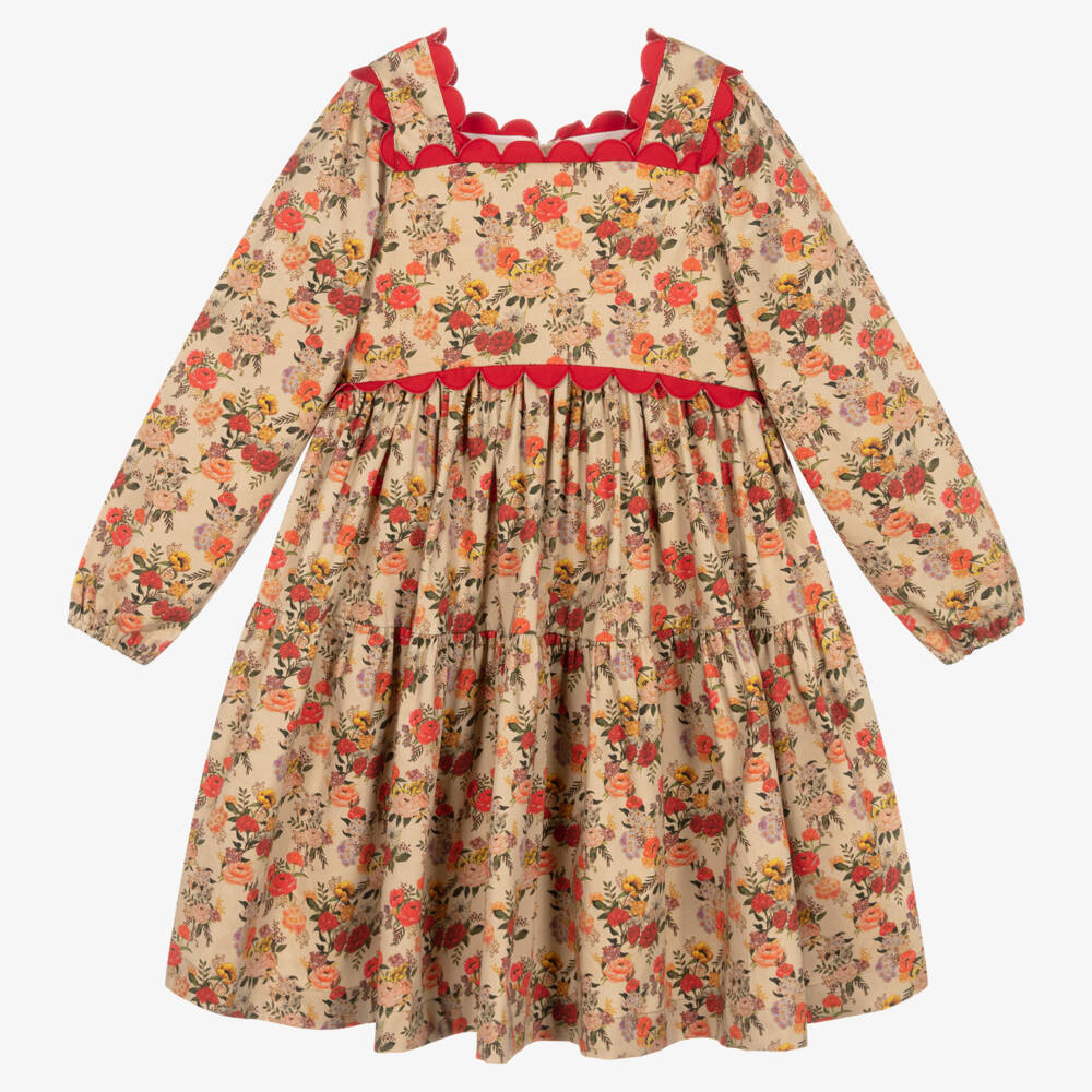 Gorgeous beige and red floral dress for girls, by British brand The Middle Daughter. Designed in London, this cotton sateen dress combines luxurious fabrics and timeless styling. It has vintage-inspired scalloped trims set on an on-trend square neckline. It has a bohemian-inspired skirt for a floaty look and fastens with a concealed zip on the back.