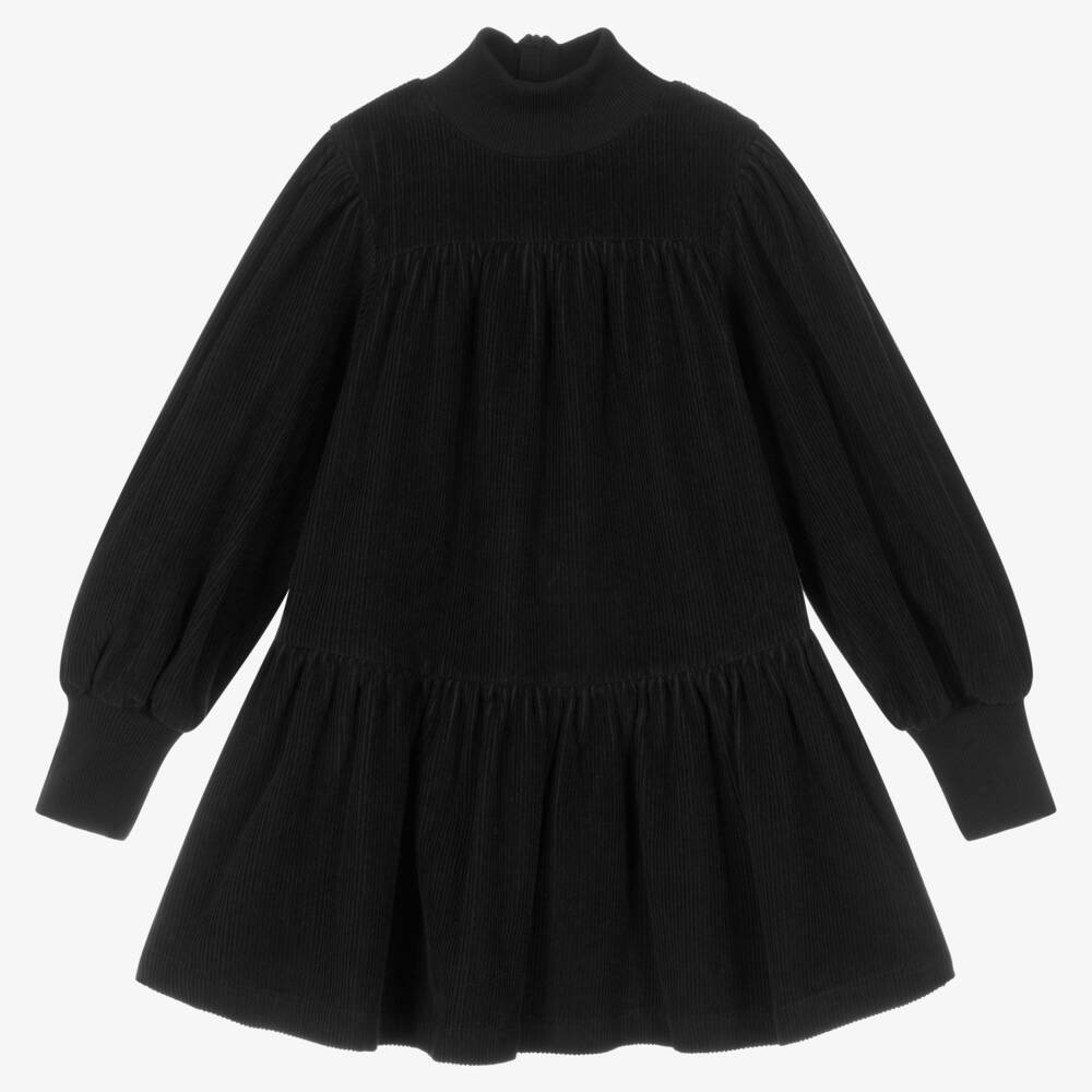 Lovely black dress for girls by The Middle Daughter, combining luxuriously soft corduroy with romantic, bohemian styling. Fastening with a smooth, hidden zip on the back, it has a high neckline and tiered skirt for floaty fashion. It has a soft woven lining, promising comfort on even the most stylish of days.