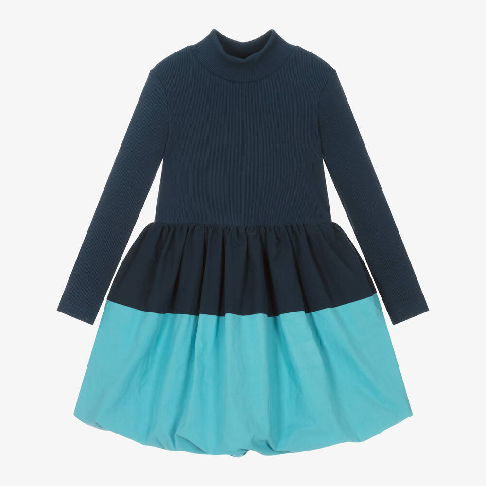 A gorgeous cotton dress for girls from British designer The Middle Daughter in contrasting shades of navy blue and sky blue. Comfortable to wear, this stylish and quirky design has a soft ribbed jersey bodice with long sleeves and a turtle neck. It pairs with a fun, puffball skirt in mid-weight cotton and is easy to wear, simply slipping over the head.
