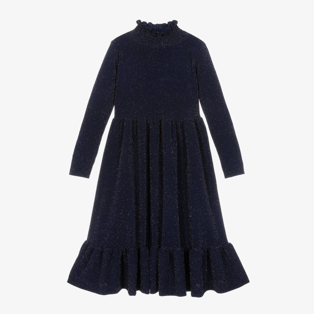Navy blue midi dress for girls by British brand, The Middle Daughter. Made in soft jersey with a pretty silver sparkle, this modest design has a ruched, high-neckline and long sleeves. The bodice flares into longer-length skirt, with a lovely tiered trim for style.