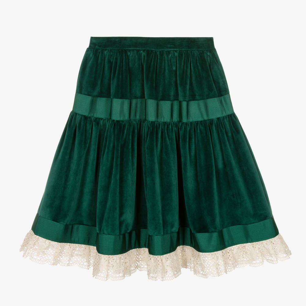 Emerald green skirt for girls by British brand, The Middle Daughter. Made in lustrous velvet, this longer-length style is detailed with tonal grosgrain ribbon and has a romantic, guipure lace hem in contrasting ivory. For comfort, the waist is partially elasticated and the skirt has a cotton lining.