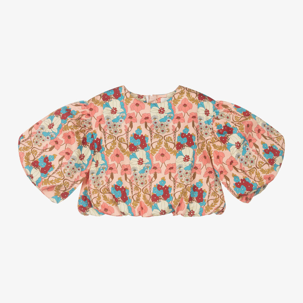Coral pink blouse for girls by The Middle Daughter, patterned with 60's inspired florals. Woven in soft cotton sateen, this cropped-length top has statement puffed sleeves and a stylish bubble hem. It fastens with a concealed zip on the back and is lined in lightweight cotton for comfort.