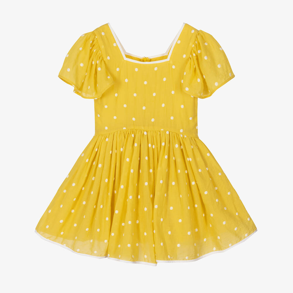 Pretty yellow cotton dress for girls by British brand The Middle Daughter, with embroidered white polka dots. Made in beautiful, lightweight voile, it has lovely design features such as white trims on the square neckline and hem, full angel sleeves and a curved waistline on the gathered skirt. The lining is gathered around the skirt too, for extra volume. The dress fastens with a neat, concealed zip around the back.