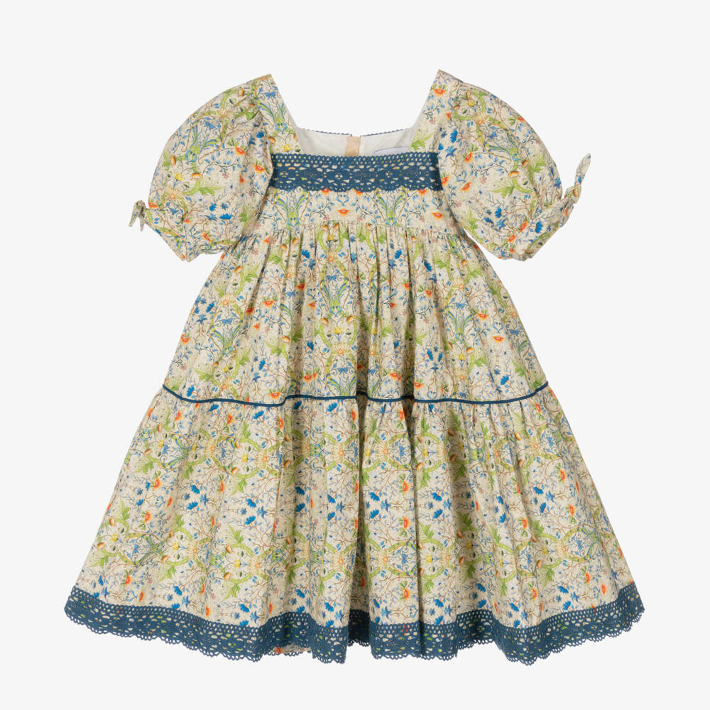Patterned in a beautiful blue, green and orange floral print, this fabulous beige dress for teen girls is by British brand The Middle Daughter. Made in lightweight cotton poplin, it has dramatic puffed sleeves with tied bows on the cuffs, and a voluminous tiered skirt with blue piped trim. There are contrasting blue lace trims on the bodice and around the hem, with a concealed zip on the back for a neat finish.