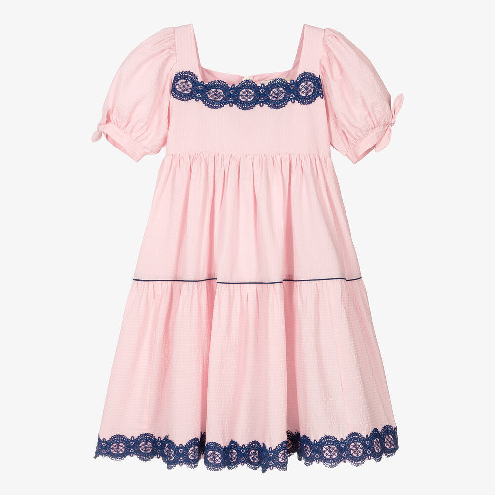 A charming pink tiered dress from The Middle Daughter, designed for teen girls with blue contrast lace. Understated and elegant, it has a square neckline that beautifully frames the chest and puff sleeves that tie on the cuffs. It is made from flowy and lightweight cotton seersucker, fastening discreetly on the back with a zip.