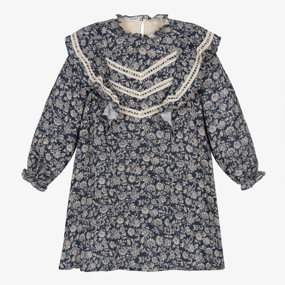 Beautiful floral print cotton dress for girls by The New Society, in navy blue and ivory. Softly woven, it has a gentle A-line shape and ruffle trims with pretty ivory lace detail. The dress has a comfortable lightweight cotton lining and fastens with a stylish keyhole button detail on the back.