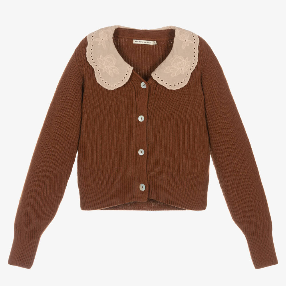 Beautifully soft brown ribbed cardigan for girls by The New Society, made in a cashmere, wool blend. A stylish V-neck design with a pretty embroidered cotton collar, it fastens with mother-of-pearl buttons on the front.