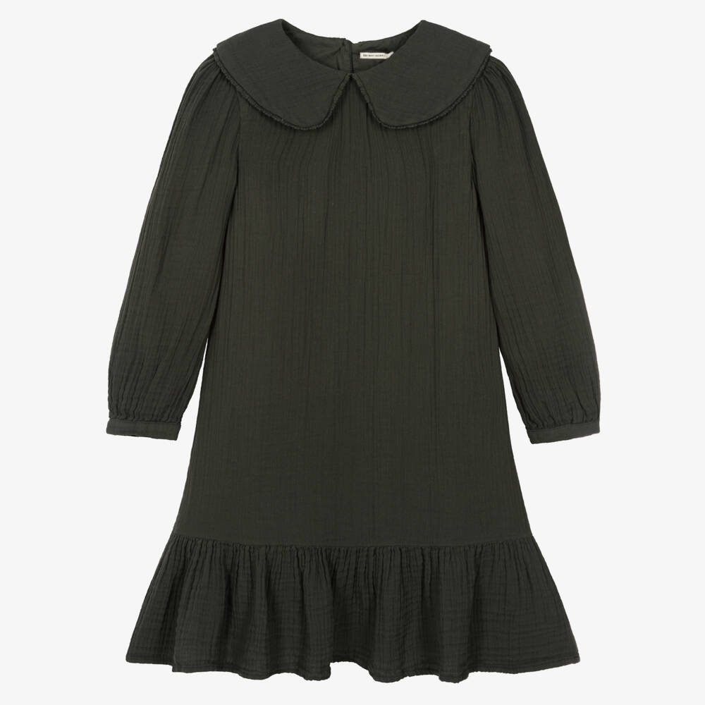 Green cotton dress for girls by The New Society, in a lovely dark forest shade. Made in beautifully soft cheesecloth with a comfortable lightweight cotton lining, this simple style has a large collar with lace trim and puffed long sleeves. A gentle A-line shape, it has a lovely ruffled hem and button fastenings on the back.