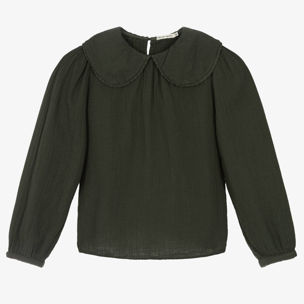 Dark forest green blouse for older girls by The New Society, made in soft double gauze cotton. A lovely casual piece, it has a large, rounded collar and narrow cuffs. There are mother-of-pearl button fastenings on the back for a neat finish.